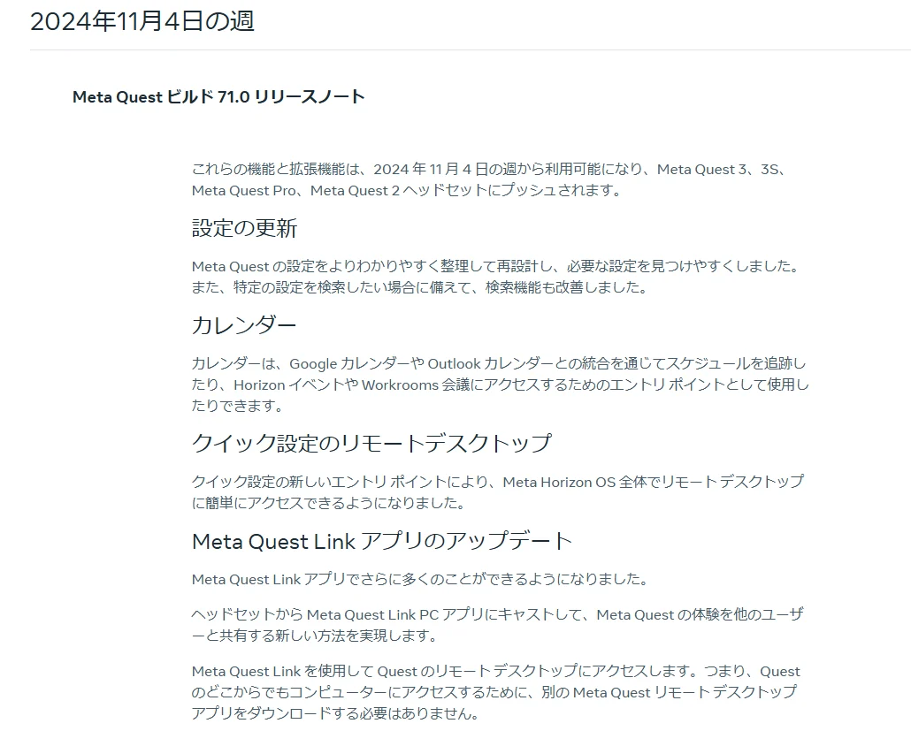 最新の一般配布バージョンであるv71が2024年11月4日の週から配布が開始されており、そろそろユーザーに行き渡ったのではないでしょうか?v71の配布対象ハードウェアは「Meta Quest 3、3S、Meta Quest Pro、Meta Quest 2」です。今回も結構多くの変更点があるのでかいつまんでチェックしていきましょう。なお、v71は先行リリースではかなり多くのテスターさんが問題を発見していたのを確認しておりますが、正式バージョンではしっかり修正されてきているので、降ってくるを自然と待つぐらいがいつもながらに安全でよいかもですね。