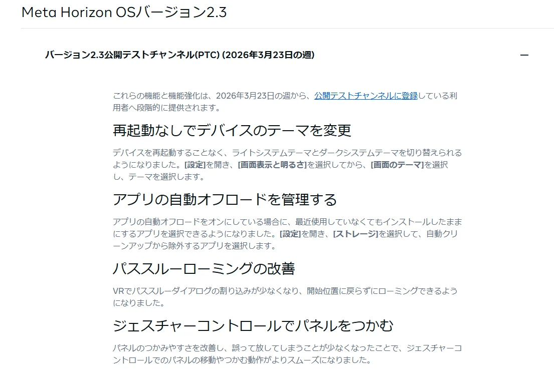 今回はMeta Horizon OS 2.3のPTCリリース内容を確認してみました。重ねてVer 2の所感や、今後のOS開発の方向性の考察なども少ししてみました。いえばQuest3から長らく新型がでていないことや、半導体不足などで他社製品はどんどん値上げされていったり、再びサングラススタイルに回帰するような流れが見えたりと、今年から来年にかけてVR/MR業界は大きく変わっていく中かな?と個人的には感じております。アプリケーションの開発の視点も今後はいれながら進化を追っていけたらと。